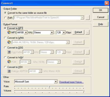 可以把 TXT 文字檔直接轉換成 MP3、WAV、WMA、OGG 或 VOX 檔,有別於一般 Text to